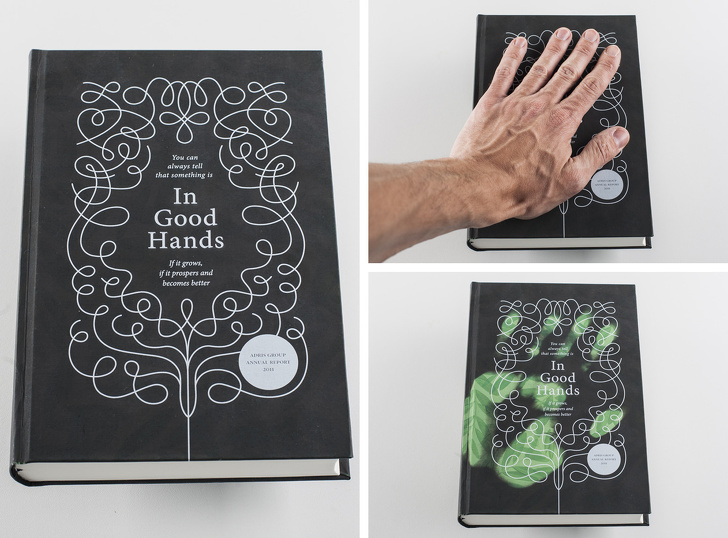 Компанія Adris grupa, зуміла вистояти незважаючи на кризу, представила щорічний звіт під назвою «In good hands» («В хороших руках»). Обкладинка реагує на тепло від дотиків і змінює свій колір, а всередині книги, крім тексту, можна побачити чорні зображення, що нагадують фігури, створені руками в театрах тіней. Якщо долонями нагріти сторінку з малюнком, замість нього дійсно з'являються складені певним чином руки. Ця своєрідна метафорична ілюстрація, створена агентством Bruketa&Zinic&Grey, показує, що руками можна зробити все що завгодно.