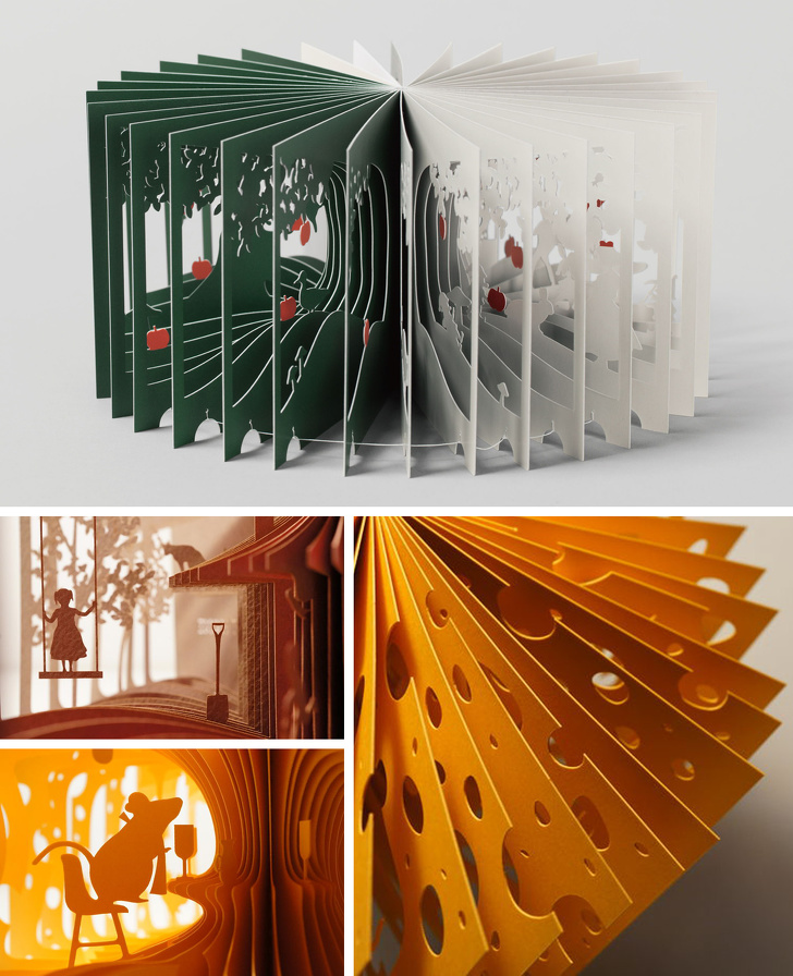 Японський графічний дизайнер Юсуке Ооно (Yusuke Oono) за допомогою лазерного різання створює об'ємні книги, які можна вивчати з різних ракурсів. Варто розгорнути таку на 360 градусів і здається, що ти перенісся в незвичайний світ оповідання.