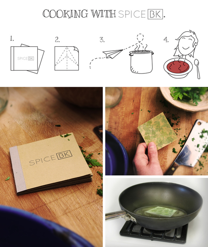 Справжня знахідка для любителів кулінарії, втомленого від постійно розсипаються по столу приправ, — книга від німецького дизайнера Ніка Бамптона (Nick Bampton). Кожна сторінка складається з спецій. Все, що потрібно, — відірвати і додати її в блюдо.