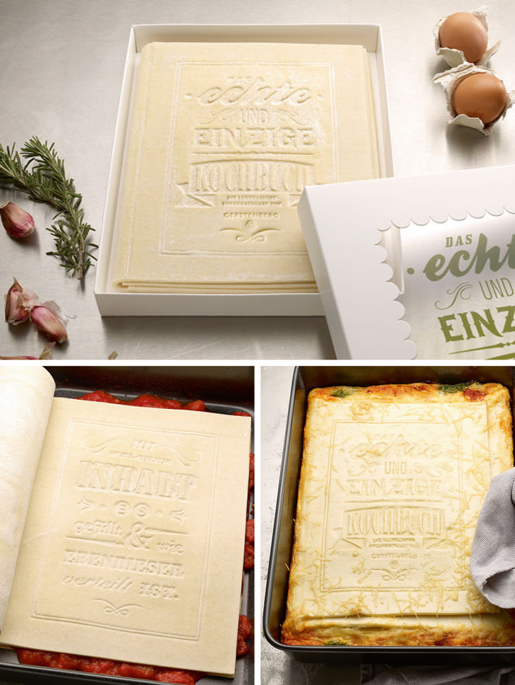 Так-так, ви не помилилися: практичні німці з дизайнерського агентства Korefe придумали кулінарну книгу, присвячену споконвічно італійського блюда — лазіння. Її текст надрукований на «папері» з тіста, а кожна сторінка розповідає, як приготувати це блюдо по верствам. Тому після знайомства з покроковим рецептом можна відразу ж і попрактикуватися: додати між сторінок відсутні інгредієнти, запекти книгу в духовці і з'їсти.