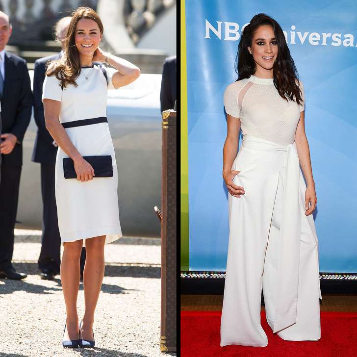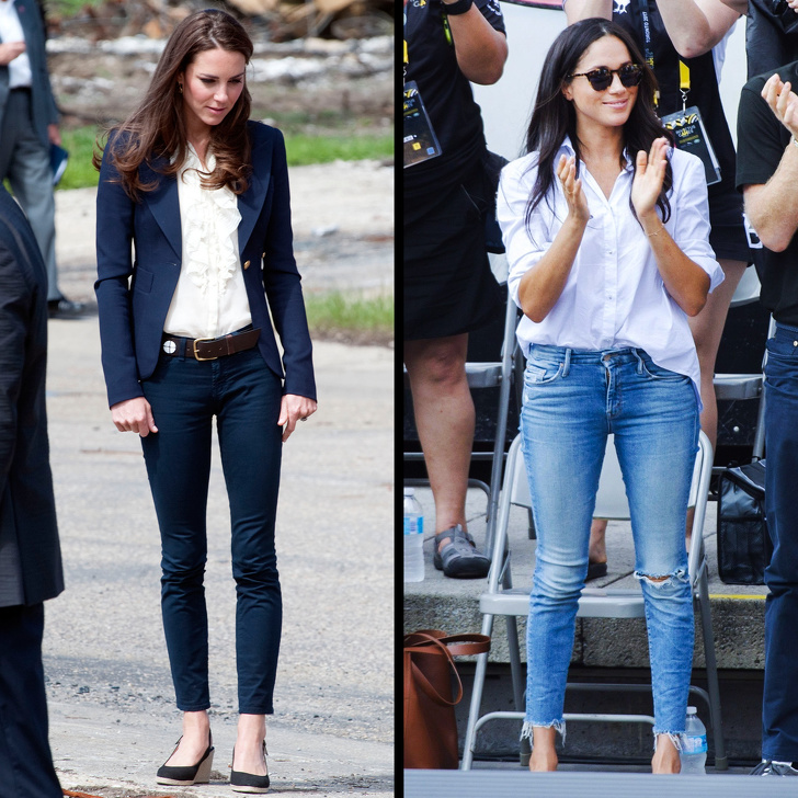 Жіночий костюм — свого роду модна уніформа. Королівський статус зобов'язує Кейт дотримуватися класичного, суворого стилю — у неї десятки брючних і юбочных костюмів. При цьому спідниці принцеса воліє вище коліна, а сам образ найчастіше доповнює жакетами приталеного силуету. Її прикладу слід і Меган.