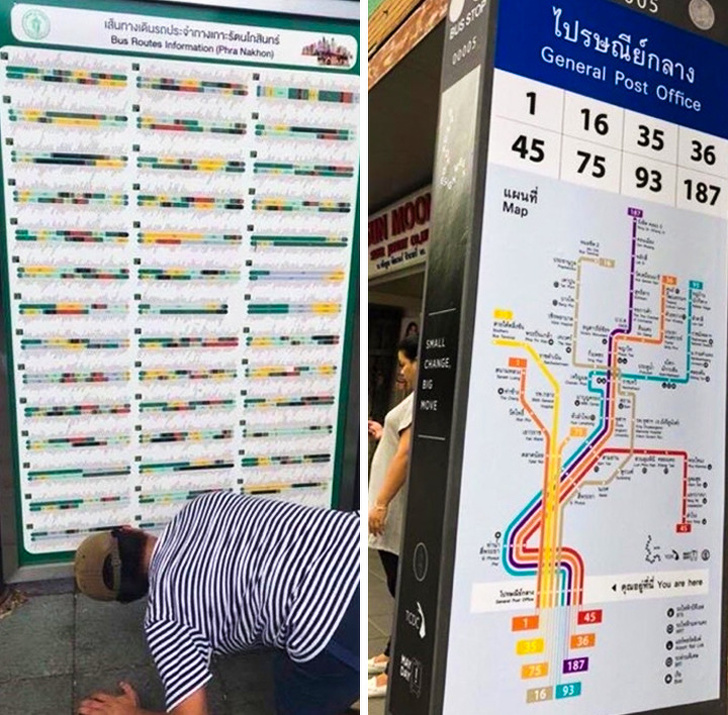 Карта автобусних маршрутів в Таїланді. Стенд зліва був розроблений державою. Праворуч — місцевими активістами