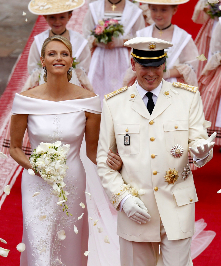 Княгиня Шарлен вибрала сукню кольору слонової кістки від Джорджіо Армані, розшита квітами. На створення розкішного весільного наряду з відкритими плечима і 5-метровим шлейфом знадобилося 80 метрів шовкової органзи, 50 метрів атласу, 40 000 кристалів Сваровські та 20 000 перламутрових крапель. Ескіз букета нареченої також був виконаний Армані і реалізований флористами з білих орхідей і фрезій.