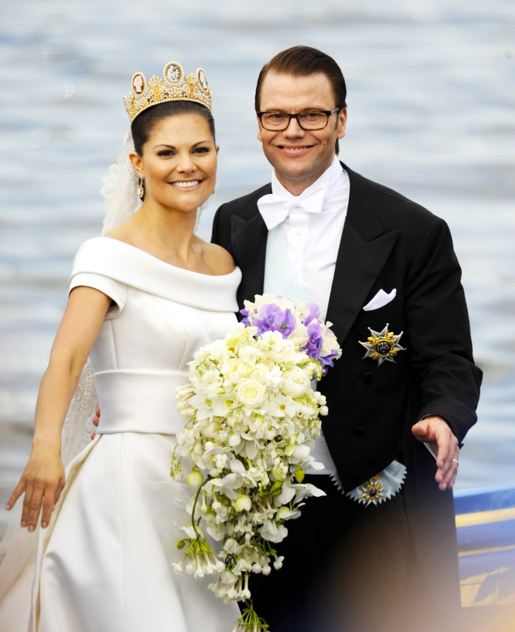 На принцеси Вікторії в день весілля було елегантне плаття без зайвих деталей, голову прикрашала масивна тіара з перлами - одна з головних реліквій шведської королівської сім'ї. Довершував образ чудовий каскадний весільний букет.