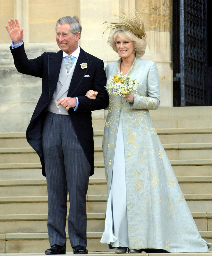 Принц Чарльз і Камілла Паркер-Боулз 35 років йшли до того, щоб офіційно пов'язати свої долі. До вівтаря Камілла пішла в оливково-блакитному платті, декорованому золотою ниткою. Голову нареченої вінчала витончена капелюшок з пір'я.