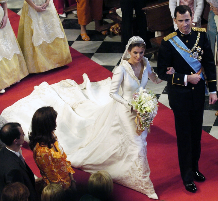 Журналістка Летісія Ортіс для весілля з принцом Астурийским Феліпе (нині король Іспанії Філіп VI) вибрала білосніжне шовкове плаття з 4-метровим шлейфом. Манжети, поділ та комір були вручну розшиті колоссям пшениці та геральдичними ліліями, які є деталями герба її чоловіка. Наряд доповнювали довга фата і фамільна тіара, яку Летісії подарувала мати нареченого.