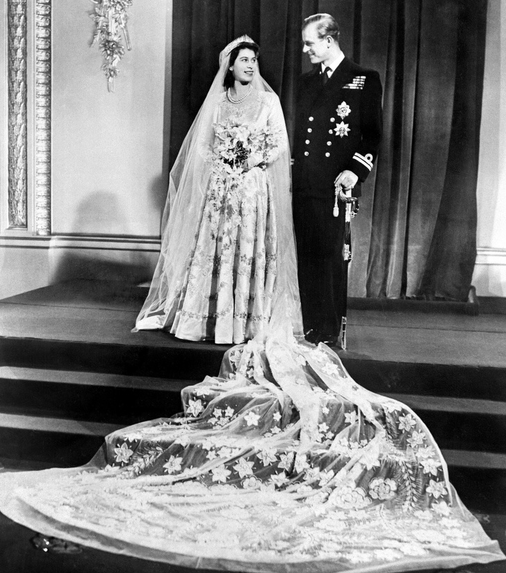 Сукня Єлизавети було розшита квітами з срібних ниток, декороване перлами і мало 4-метровий шлейф, тільки все це нісенітниця. Головне, що воно виявилося щасливим. 20 листопада 2017 року Єлизавета II і принц Філіпп відзначили платинове весілля (70 років з моменту укладення шлюбу). Цей королівський шлюб є найдовшим у світовій історії.