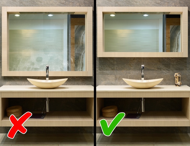 - Якщо ви стоїте перед вибором, яке дзеркало купити, — краще купіть меншого розміру і повісьте його вище раковини на 20-30 см. Тоді ви уникнете вічної прибирання у ванній кімнаті.