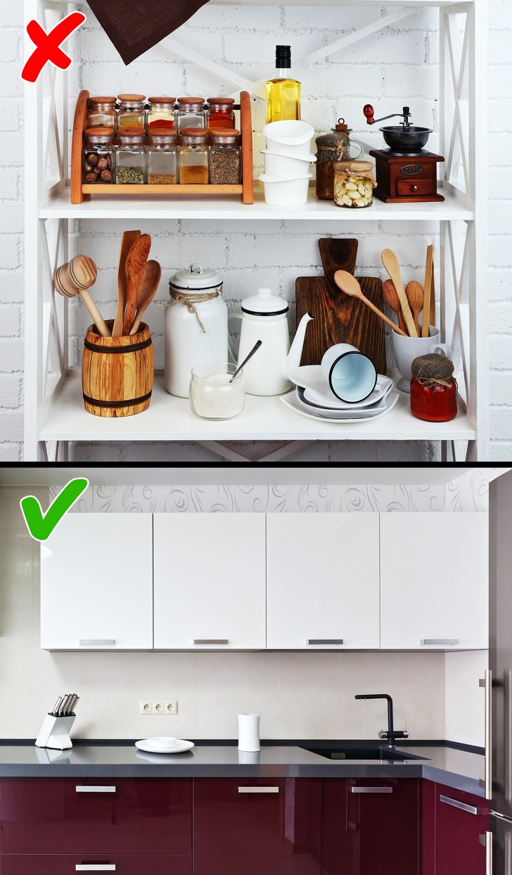 Одне з найбільш популярних рішень для кухні і вітальні — відкриті полиці у шаф або підвісні полички. На жаль, на кухонних полицях накопичується багато пилу, яка до того ж змішується з жиром і погано відмивається. Такі полки та предмети, що стоять на них, потрібно постійно протирати, інакше пил стає помітною. Ще один негативний чинник — необхідність підтримувати ідеальний порядок, адже на такі полки дійсно все підряд не поставити, інакше створюється відчуття неохайності і неуюта.