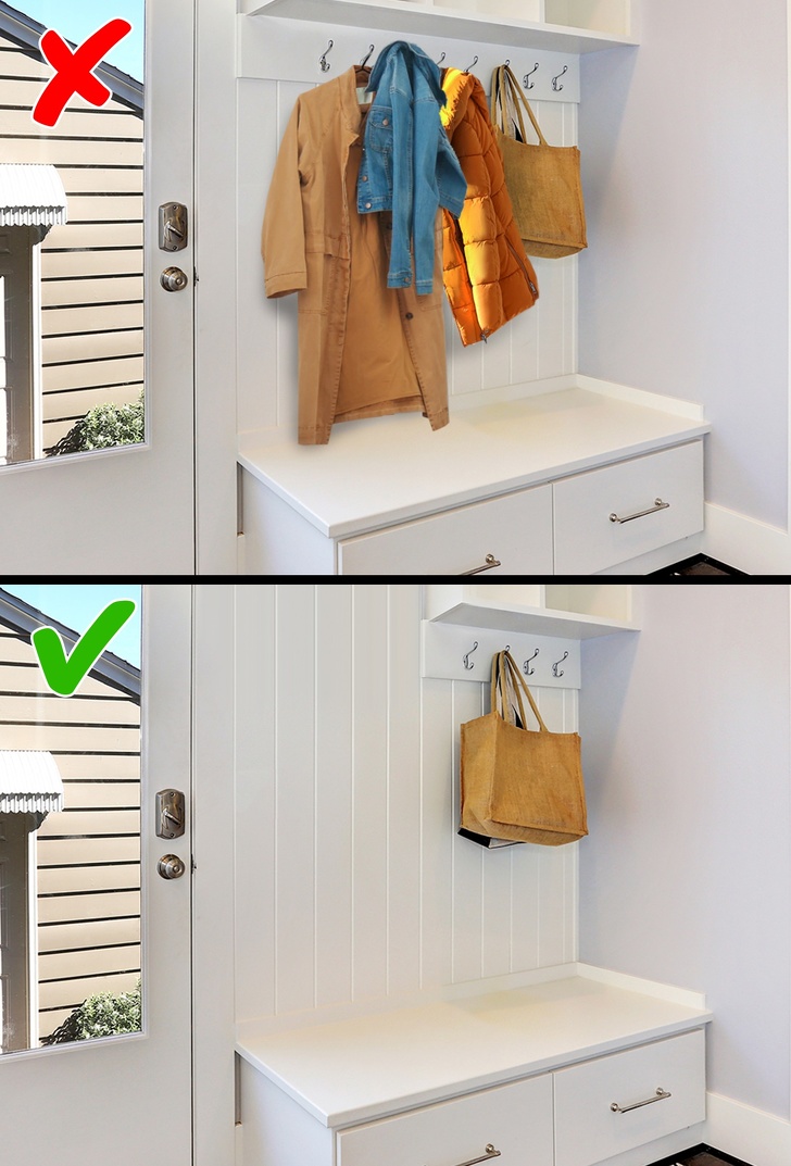 - Щоб не було спокуси навантажити вішалку великою кількістю одягу, поміняйте її на більш компактну, з меншою кількістю гачків. Для сумок можна виділити окремий гачок недалеко від вхідних дверей.