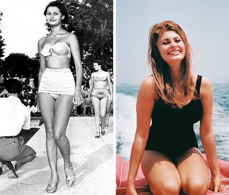 На знімку зліва 16-річна Софія дефілює в атласному купальнику по подіуму на конкурсі «Міс Італія» 1950 року. Конкурс став для дівчини доленосним: вона отримала звання «Міс Елегантність» і познайомилася з кінопродюсером Карло Понті, який в майбутньому став її чоловіком. А на знімку праворуч — блискуча кінодіва, яку весь світ дізнався під ім'ям Софі Лорен.