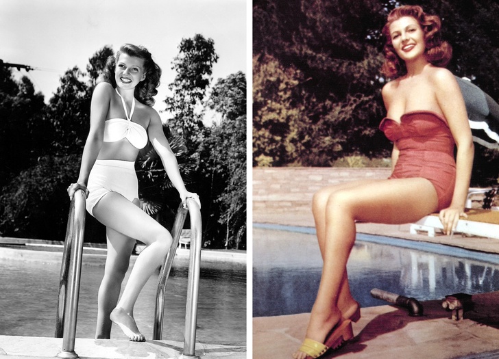 Рудоволоса Рита Хейворт — справжня богиня золотого століття Голлівуду. Особливу любов Рита мала до роздільним купальників з високою талією і з задоволенням позувала в них фотографам. Але і в закритому червоному купальнику вона просто чудова.
