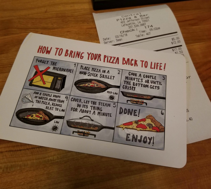 У піцерії до кожного замовлення з собою дають інструкцію, яка допоможе правильно розігріти піцу і не зіпсувати її смак будинку