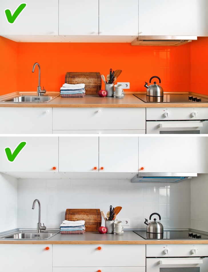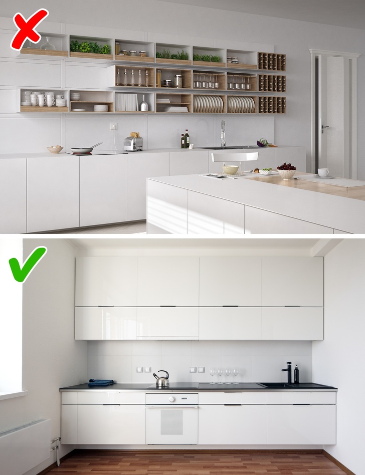 Відкритий простір — великий простір. Вірно? Ні! Відкриті полиці гарні тільки на розворотах журналів, а в реальності вони дуже швидко перетворюються в захаращений простір (особливо це стосується кухні). Замініть відкриті полиці навісними шафами одного кольору зі стінами: вони зіллються з навколишнім простором, і приміщення буде здаватися трохи більше.