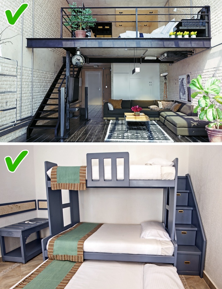 Розставляючи меблі по периметру, ми забуваємо, що у нашої кімнати є ще і висота. Спробуйте розмістити меблі «по вертикалі»: приміром, придбайте ліжко, у якій внизу є робочий стіл. Крім того, в студіях з високими стелями є можливість спорудити імпровізований 2-й поверх, на якому можна облаштувати місце для сну або роботи — так ви отримаєте практично окрему кімнату. А для зберігання рідко використовуваних речей можна зробити антресолі.
