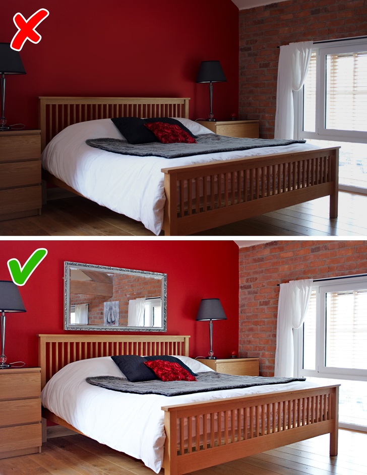 Чим темніше приміщення, тим менш просторим воно здається — це аксіома. Якщо вікна вашої квартири виходять на тіньову сторону, повісьте дзеркало навпроти них: навіть невелика кількість світла буде відбиватися його поверхнею, що візуально зробить кімнату більш об'ємною.