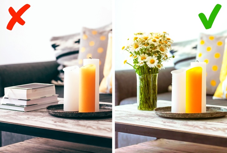 Букет свіжих квітів, підібраний в тон інтер'єру, може стати кращою прикрасою вашої вітальні. Не потрібно витрачати величезні гроші на покупку квітів: великий букет польових ромашок або гвоздик буде виглядати достойніше, ніж дорогі троянди. Іноді корисно створити настрій у набридлою обстановці.