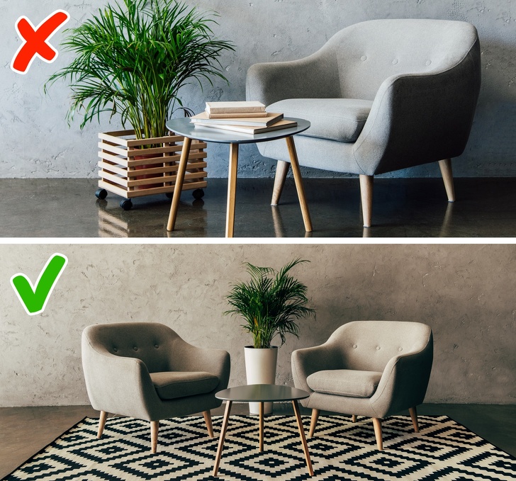 Симетричні інтер'єри виглядають велично і грунтовно, створюють відчуття балансу. Тому симетрія — найкраща ідея для тих, хто не хоче вкладати великі суми в предмети обстановки. Виберіть недорогі аксесуари і розставте їх по обидві сторони від композиційного центру кімнати. Симетрично розставлені крісла у вітальні відразу додадуть їй відтінок розкоші.