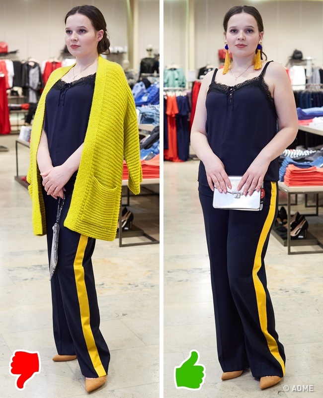 - Вибирайте одяг правильного розміру: балахон, як ми вже говорили, зробить вас ще більше, а наряд «в обтяжку» лише підкреслить проблемні місця.