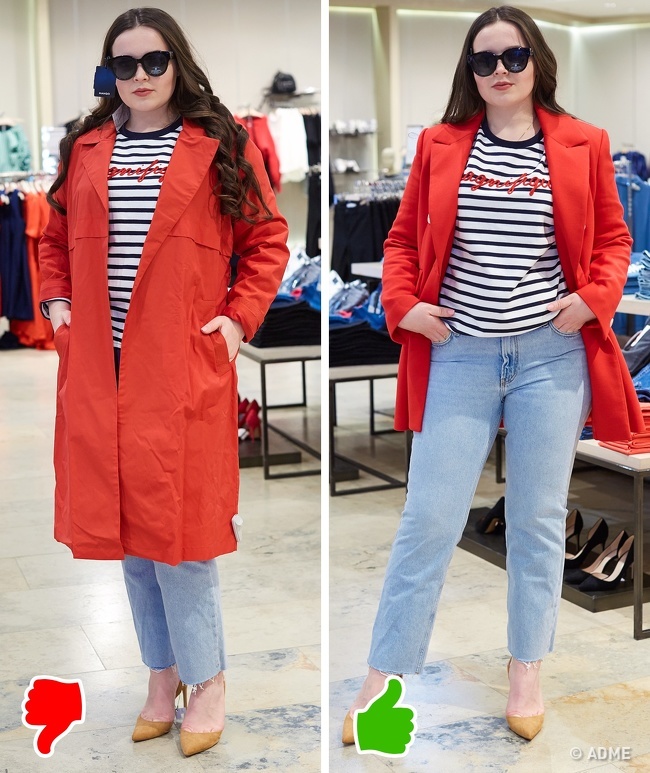 Чомусь багато дівчат вважають, що об'ємні речі обов'язково приховають зайві кілограми. Але це в корені хибна думка: мішкуватий одяг не робить стрункішою, а тільки додає об'єм силуету. Тому замість просторого довгого тренча краще одягти, наприклад, піджак прямого крою.