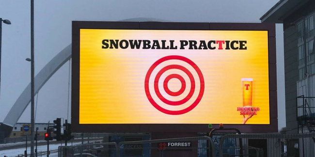 Шотландський пивний бренд вміло скористався примхами погоди. Творці цієї реклами придумали, як розвеселити людей під час тривалого снігопаду в Глазго, і не прогадали. Вони встановили гігантський білборд з мішенню для кидання сніжків.