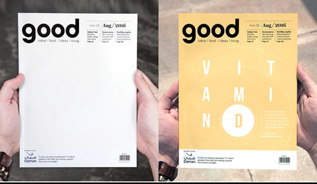 Ця реклама, можливо, навіть врятує комусь життя. Незважаючи на те, що ОАЕ-чи не найбільш сонячна країна світу, левова частка її населення потерпає від нестачі вітаміну D. Національна страхова компанія Daman створила спеціальні обкладинки для журналів, текст на яких було завдано світлочутливими чорнилом. Прочитати його можна тільки під впливом сонячних променів, що змушувало людей отримати необхідну порцію вітаміну.