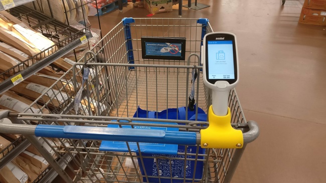 Ця візок в супермаркеті обладнана сканером, який підраховує суму всіх покупок в ній