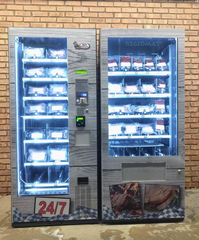 Біля м'ясного магазину встановлені автомати зі свіжим м'ясом, яке можна купити, навіть коли магазин закритий