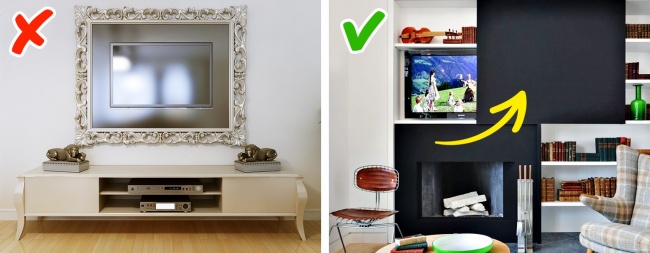 Телевізор не варто поміщати в розкішну раму, намагаючись замаскувати, адже це не картина великого художника. Якщо ви хочете вписати його в інтер'єр або заховати, то можна зробити рухливу панель, що приховує його, коли потрібно.