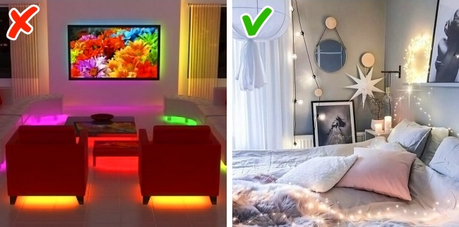Якийсь час тому були дуже модними «ширяють» ліжка, стелі і т. д. Але кімната з такою підсвіткою, особливо якщо вона яскравих кольорів, нагадує не то солярій, не то нічний клуб. Якщо хочете створити затишну обстановку, краще повісити, наприклад, гірлянди — вони створять затишок.