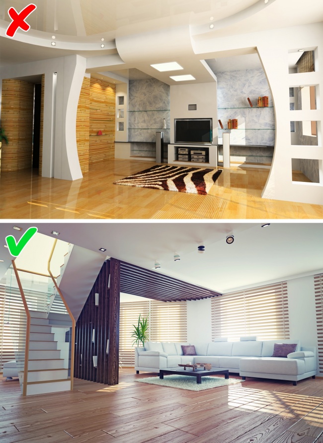 Складний багаторівневий стеля з закарнизне підсвічуванням — відмінний пилозбірник. Вибираємо рівну стелю і не думаємо про те, де дістати драбину, щоб протирати важкодоступні ніші.