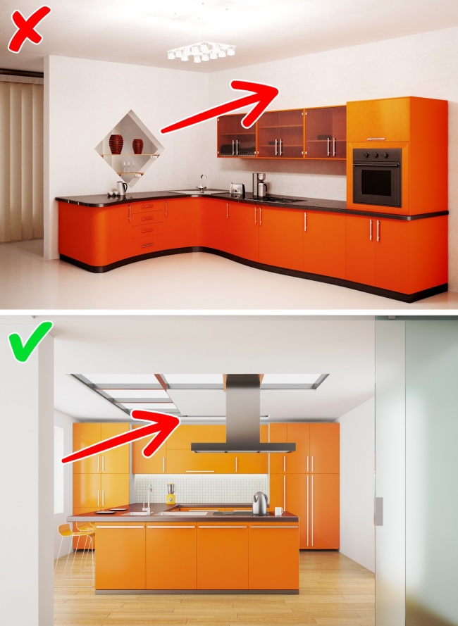Шафи, в тому числі і на кухні, повинні бути не тільки вбудовані в стіни, але і щільно пригнані до стелі, щоб на верхньому краї гарнітура, до якого так непросто дістатися, не накопичувалася пил. Крім того, так ми захистимо себе від спокуси розставити на цьому видному місці непотрібні вази і банки.