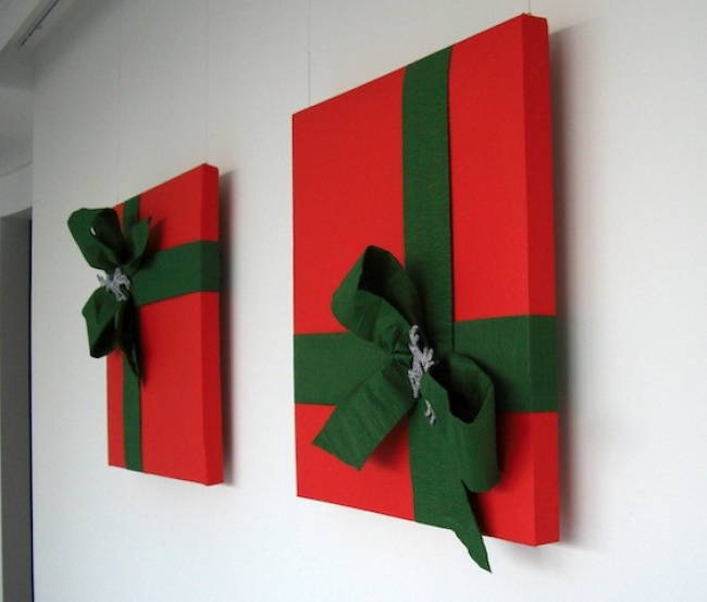 Порожні коробки з-під піци або старі полотна перетворюються у святкові панно з допомогою обгорткового паперу або тканини і стрічок. Простіше нікуди!