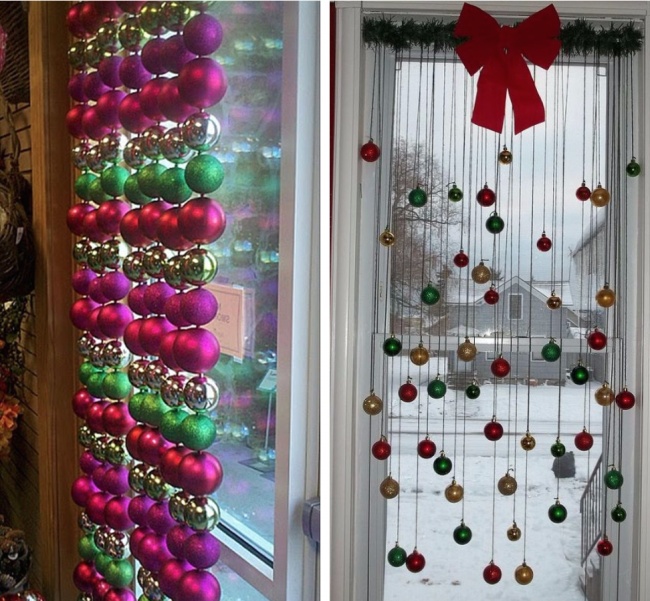 Вікна можна прикрасити не тільки сніжинками і малюнками, але і такими «жалюзі». Тим більше що вам потрібно тільки нанизати ялинкові кулі на стрічки і повісити.