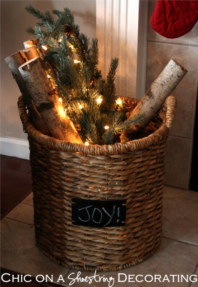 Варіант нехитрого, але красивого декору для тих, хто завжди поспішає. Складіть в кошик гірлянду, ялинові гілки та / або колоди — готово! Більше натхнення можна почерпнути тут.