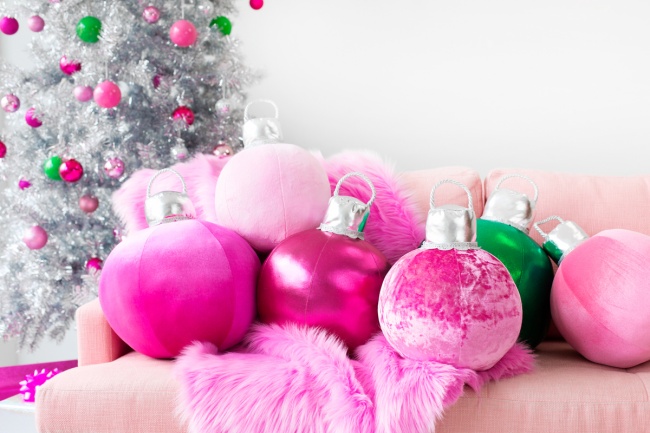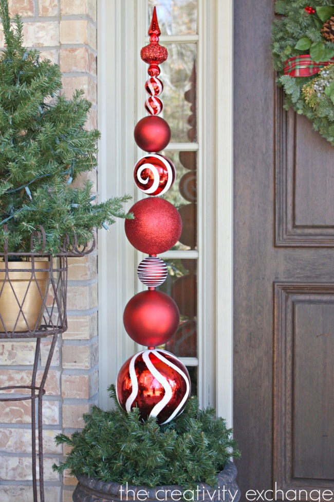 Топіари з ялинкових іграшок — ще одна проста і дозволяє експериментувати ідея для прикраси будинку. Можна використовувати старі іграшки, зробити маленький топіарі для будинку або великий для вулиці. Останнім відмінно вийшло тут.