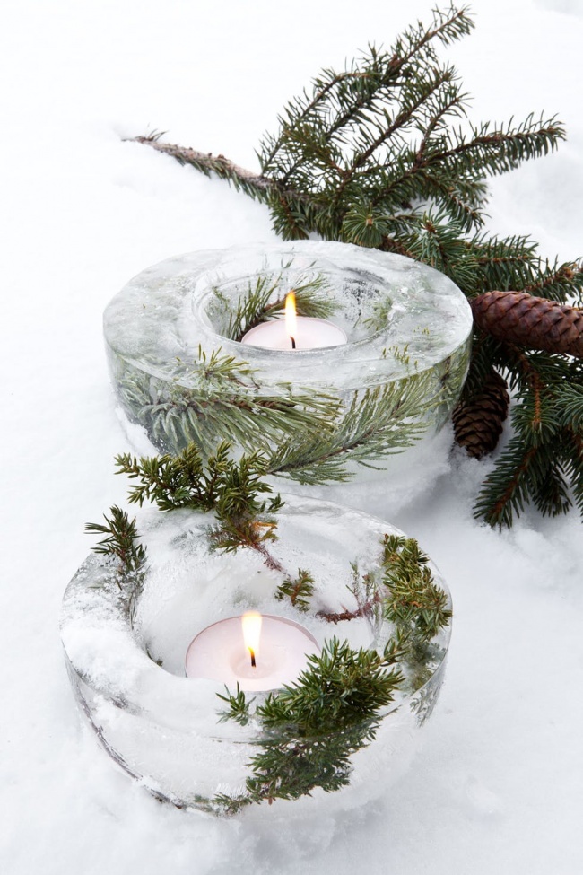 Якщо ви живете у власному будинку або плануєте зустрічати Новий рік на дачі, придивіться до ідеї вуличних світильників з льоду. В цьому блозі добре пояснюють, як їх зробити, а з формою і наповненням можна експериментувати.