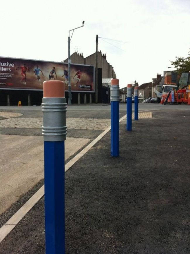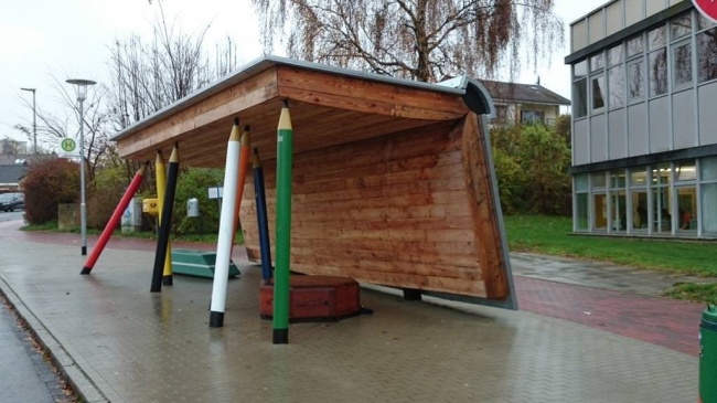 Зупинка шкільного автобуса, зроблена у вигляді книги, яка тримається на різнокольорових олівцях