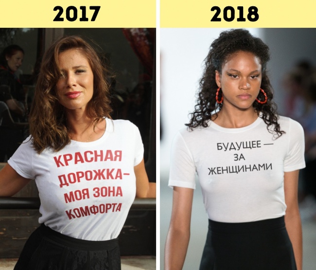 2018 рік обіцяє цікавий тренд — тепер можна висловлюватися за допомогою написів на футболці. Так, і в 2017 році футболки з написом були у кожної модниці, але зараз все серйозно. Більше ніяких легковажних фраз, тепер те, що ви носите, — це вираз ваших думок і життєвої позиції, нехай навіть і провокаційною. Модні будинку Dior, Haider Ackermann, Prabal Gurung, Ashish і багато інші вже встигли показати життєстверджуючі гасла і девізи у своїх колекціях 2018 року.