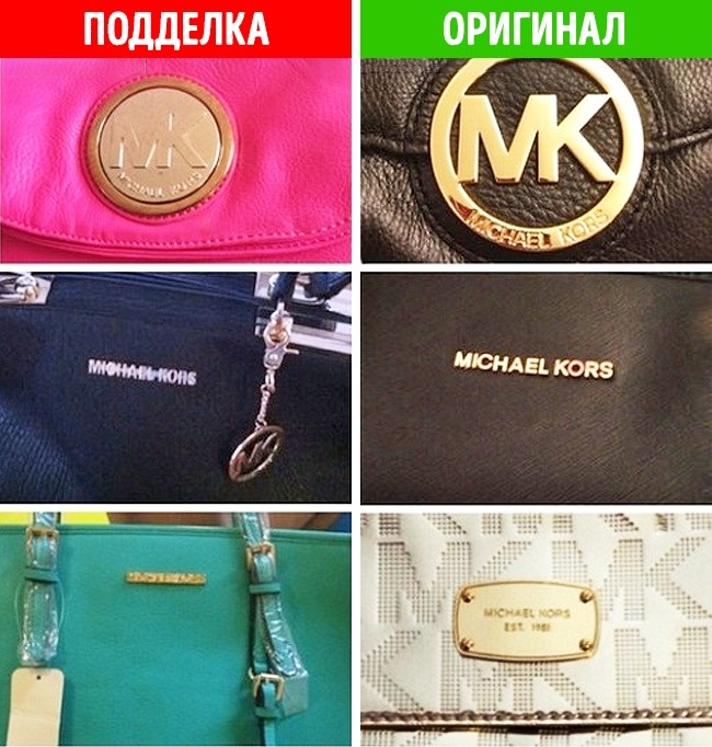 - Підвісний металевий логотип, що відрізняє багато моделей сумок Michael Kors, в оригінальному варіанті повинен збігатися за кольором з іншої фурнітурою. Крім того, на автентичність може вказати вагу замків, ланцюжків та іншої декоративної фурнітури. В оригіналі вони виконуються з високоякісного металу, який досить важкий.