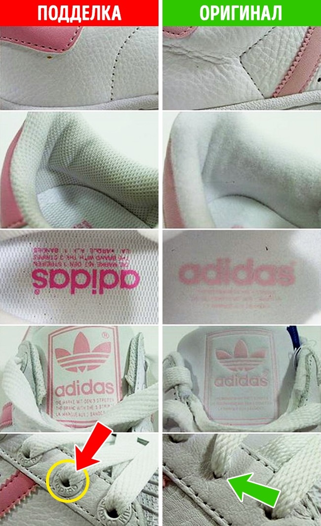 - Логотип у цих кросівках виконано тисненням, а в підроблених наклеєний або просто намальований. Також зверніть увагу на дірочки для шнурків: на багатьох класичних моделях вони відсутні, а у підробках їх зазвичай ставлять без розбору. У такому разі обов'язково перевірте виріб на офіційним сайті.