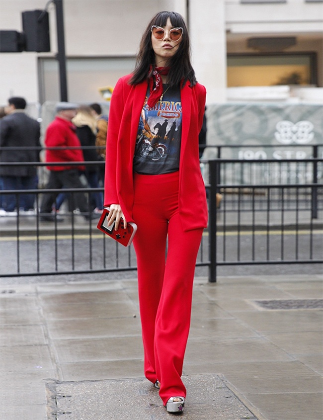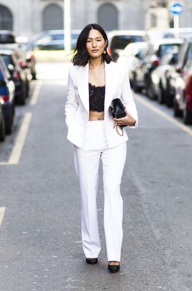 Для сучасної моди характерне змішання стилів. Тому елегантні костюми сміливо поєднують з елементами спортивного одягу: простими майками, худі і т. п. І це виглядає куди більш свіжо і цікаво, ніж з класичної блузою. А от взуття варто було б поміняти на більш актуальну — без платформи в подносочной частини.