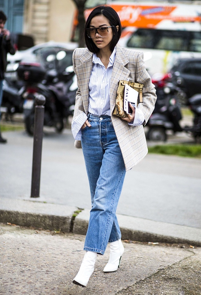 Класична сорочка в тонку смужку — це та річ, яка «стерпить» будь-який, навіть самий гарячий модний тренд: і спідницю з пір'я, і шкіряні легінси, і жакет з акцентовано збільшеними плечима, як у даному випадку. Джинси теж належать до «базі» гардероба, але в даному конкретному образі у них не цілком класичні пропорції.