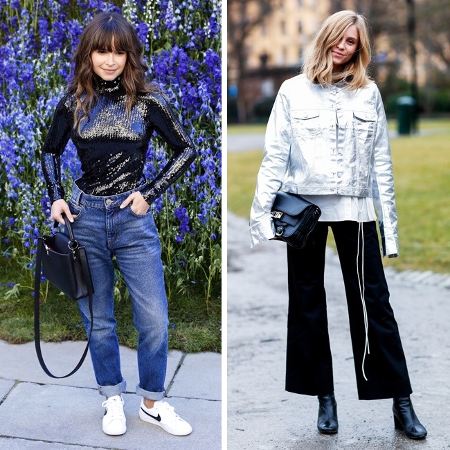 Те, що блискучі тканини днем виглядають недоречно, — це ще одне правило, з яким варто негайно розпрощатися. Правда, бажано, щоб у повсякденному образі був тільки один блискучий предмет, у компаньйони до якого підібрані максимально прості речі: джинси, майки, джинсові сорочки, прості блузки, светри, кросівки і т. п.