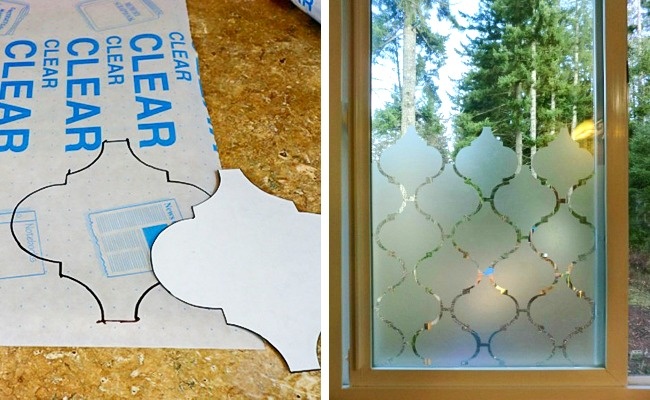 Ось такий непрозорий оригінальний візерунок на склі можна зробити з самоклеючої плівки.