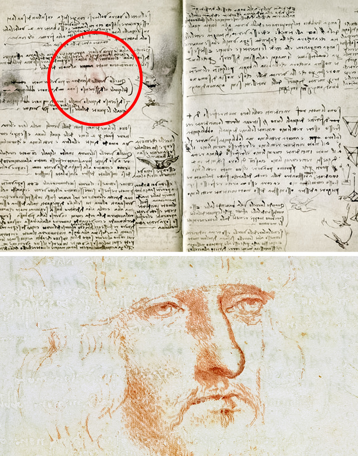 Чоловік, який вивчав книгу «Кодекс про політ птахів», помітив на одній з сторінок смутні обриси обличчя і звернув на це увагу реставраторів. Застосувавши сучасні технології, фахівці змогли зробити зображення начерку більш чітким і порівняти його з єдиним відомим на той момент автопортретом да Вінчі. Риси обличчя збігалися. Здається майже неймовірним, але художник так спритно сховав свій портрет серед рядків рукописи, що той залишався ніким не поміченим більше п'яти століть.