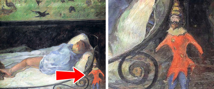 На картині «Сплячий малюк», повного спокою і безтурботності, яскравим і трохи моторошним плямою виділяється іграшка — паяц. Лялька з людським, живим обличчям ніби дивиться на глядача, і розташована вона тут невипадково. Якщо придивитися уважніше, в рисах незвичайного клоуна можна дізнатися самого Гогена.