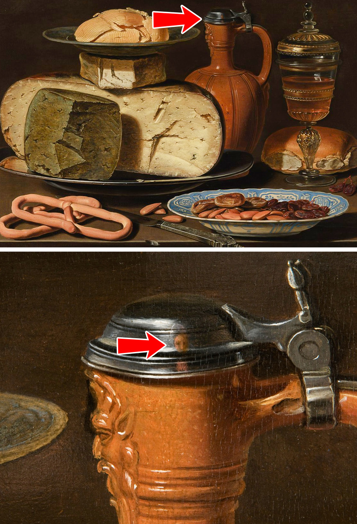 У картині «Натюрморт з сирами, мигдалем і кренделями» на олов'яну кришку бутлі Петерс завдала відображення свого обличчя, а свої ініціали залишила на срібному ножі для масла, що лежить на передньому плані картини.