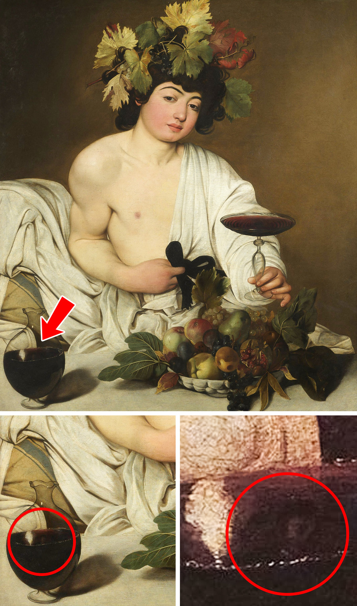 Автопортрет на картину Караваджо «Вакх» практично неможливо побачити неозброєним оком. За більш ніж 400 років полотно сильно поміняв кольори, і багато деталей залишилися ледве помітними. Але після реставрації італійські дослідники виявили в графині з вином крихітний автопортрет художника. Під спеціальним освітленням їм вдалося розглянути навіть риси обличчя Караваджо, схилився над мольбертом.