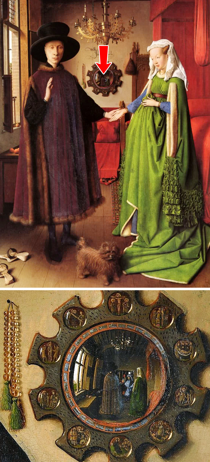 Найвідоміше полотно Яна ван Ейка "Портрет подружжя Арнольфіні" тут і там наповнений важливими деталями і посиланнями, а спори про головних його персонажів не припиняються і досі. За однією з версій, художник зобразив на картині себе разом з дружиною, з іншого – "сховав" себе в дзеркалі. На користь другого припущення вказує і напис над дзеркалом, яка говорить: "Ян ван Ейк був тут". Ймовірно, одна з фігур, що стоять у дверях кімнати, і є сам майстер.